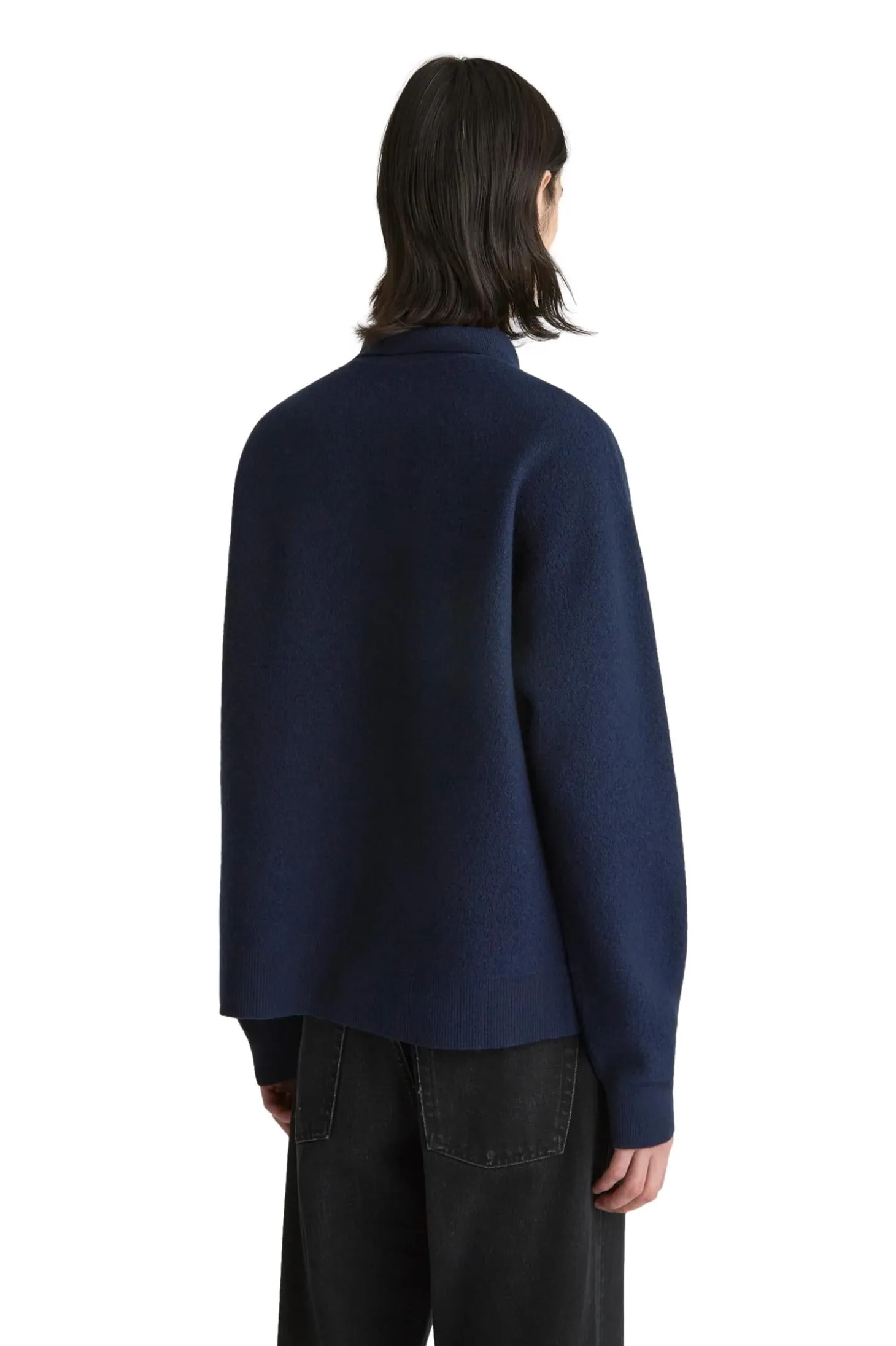 Designet med senkede skuldre, en rett, firkantet passform, med en ribbet kant som henger rett, med splitter i sidene. Avsluttet med en ribbet krage med kvart glidelås.