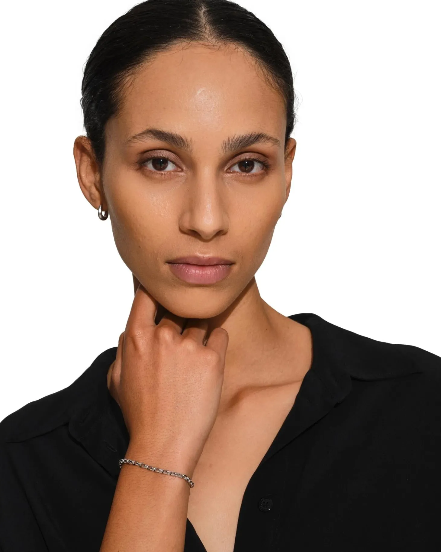 Et delikat par Huggies-øreringer, laget av 925 sterlingsølv med sateng-rodiumbelegg. Alle edle metaller er 100 % resirkulert.
