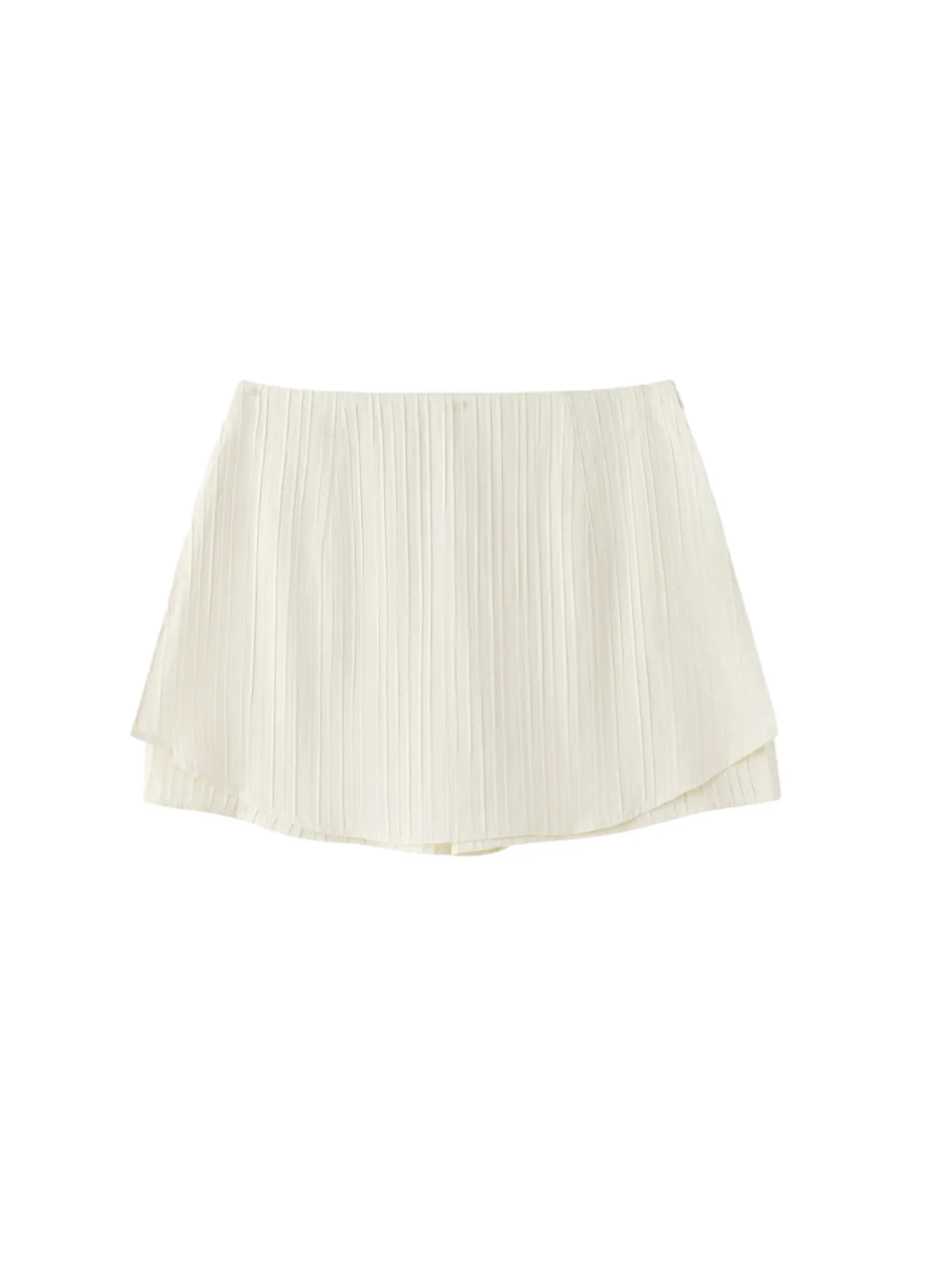Dette teksturerte stripete korte skjørtet har et subtilt vertikalt linjemønster som gir stoffet visuell interesse. Fronten er knappet opp med små hvite knapper, som skaper en illusjon av en skjorte underdel.