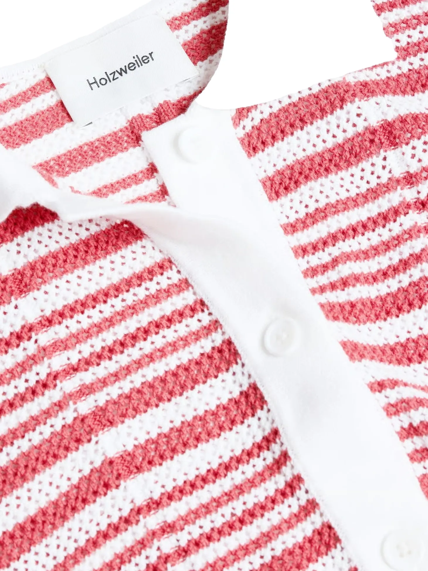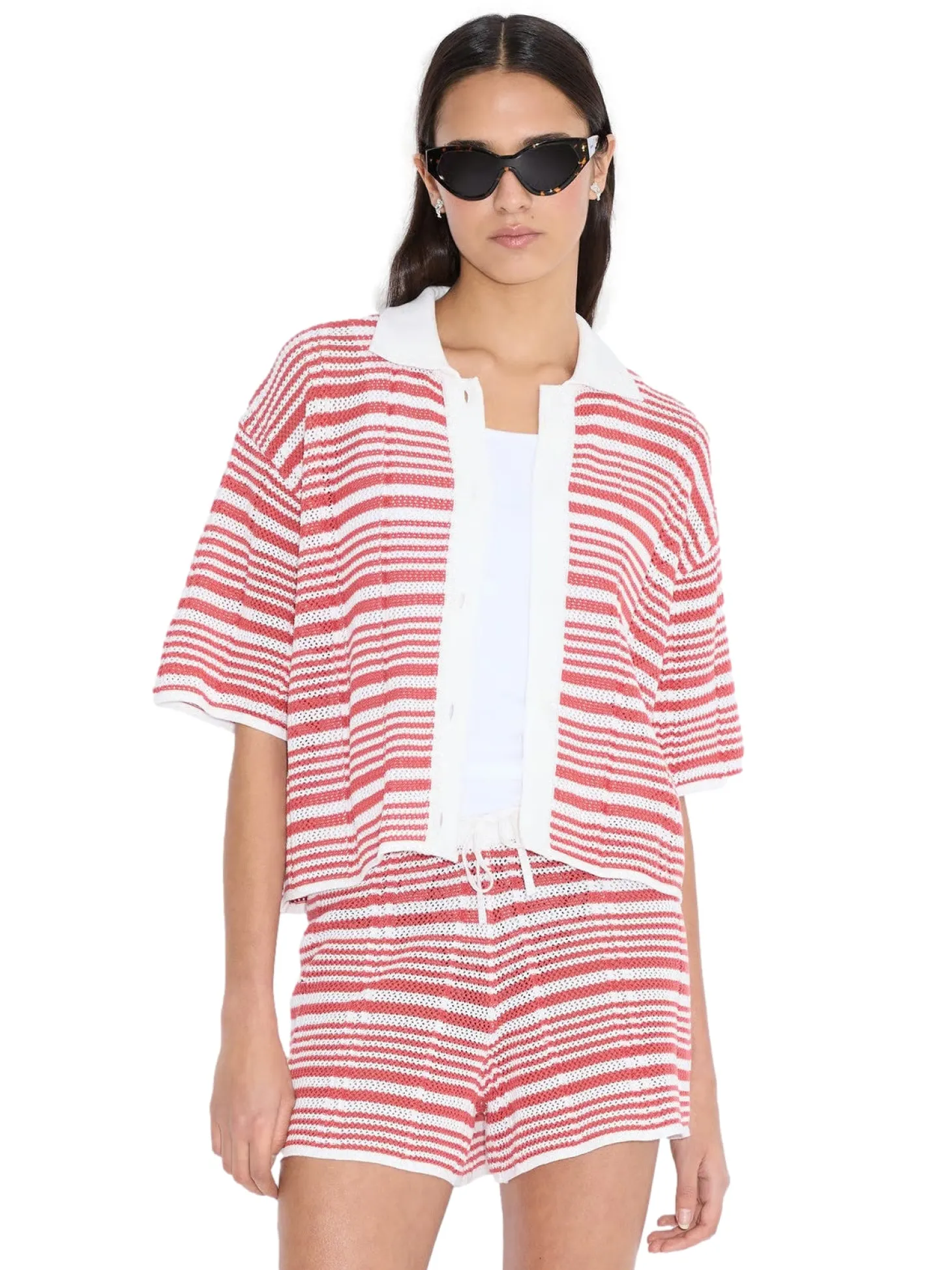 Kelp Striped-skjorten er laget av ren økologisk bomull i heklestrikk. En kortermet stil med oversized passform, den har en klassisk krage og en knappestolpe foran. Style med den matchende Kelp Striped-shortsen.