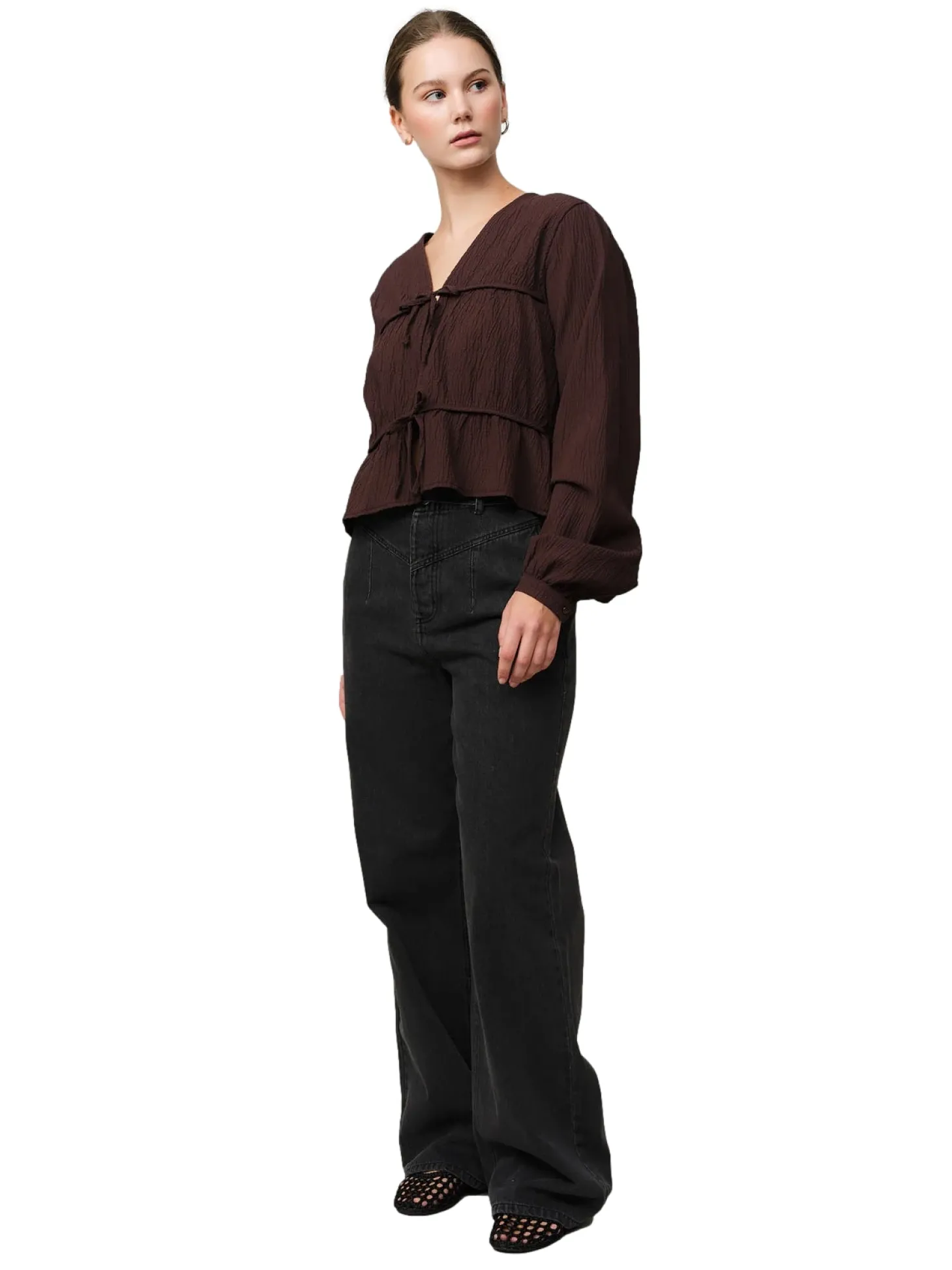 Mercer-strengbluse er en flatterende bluse med dobbel knytedetaljer foran.