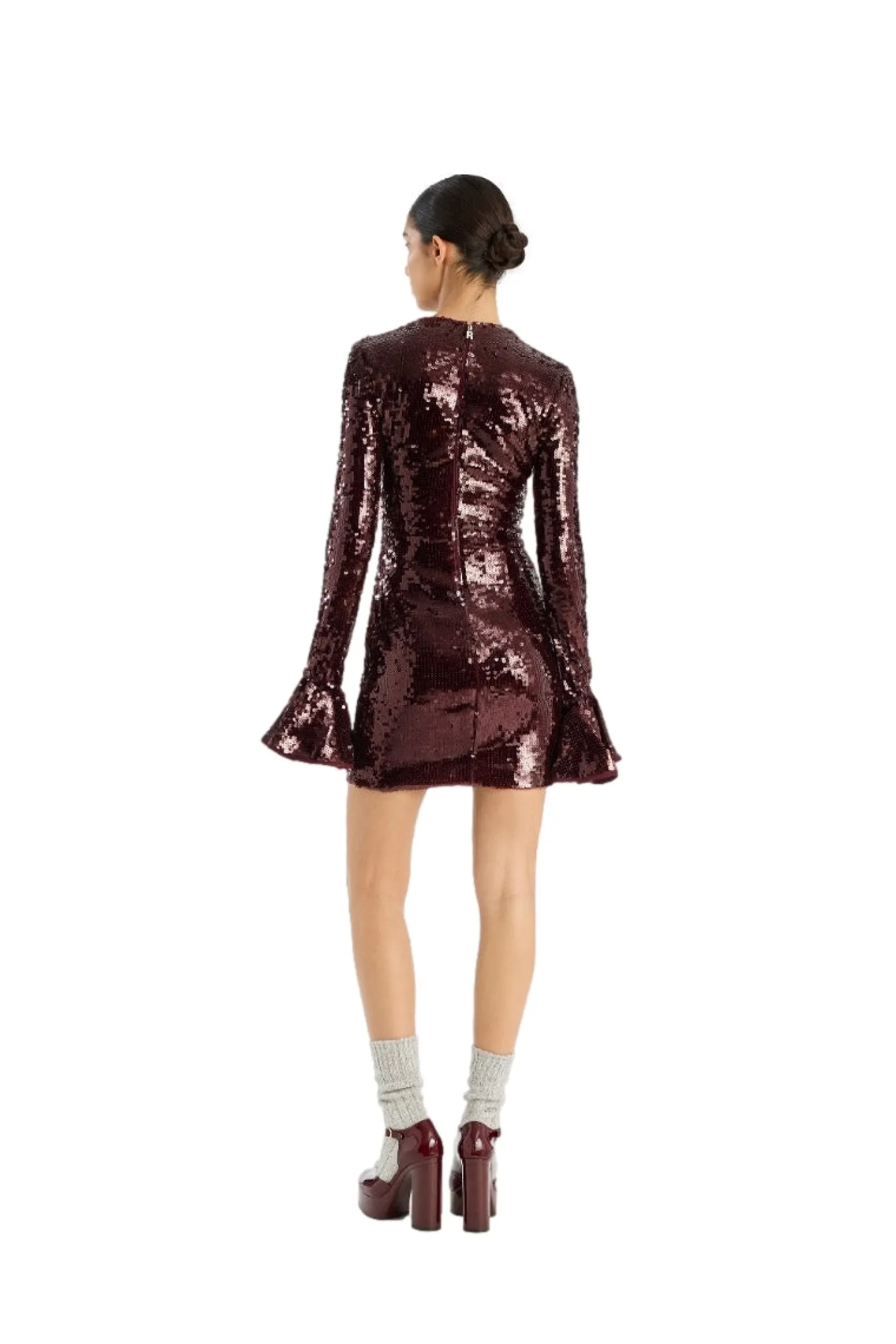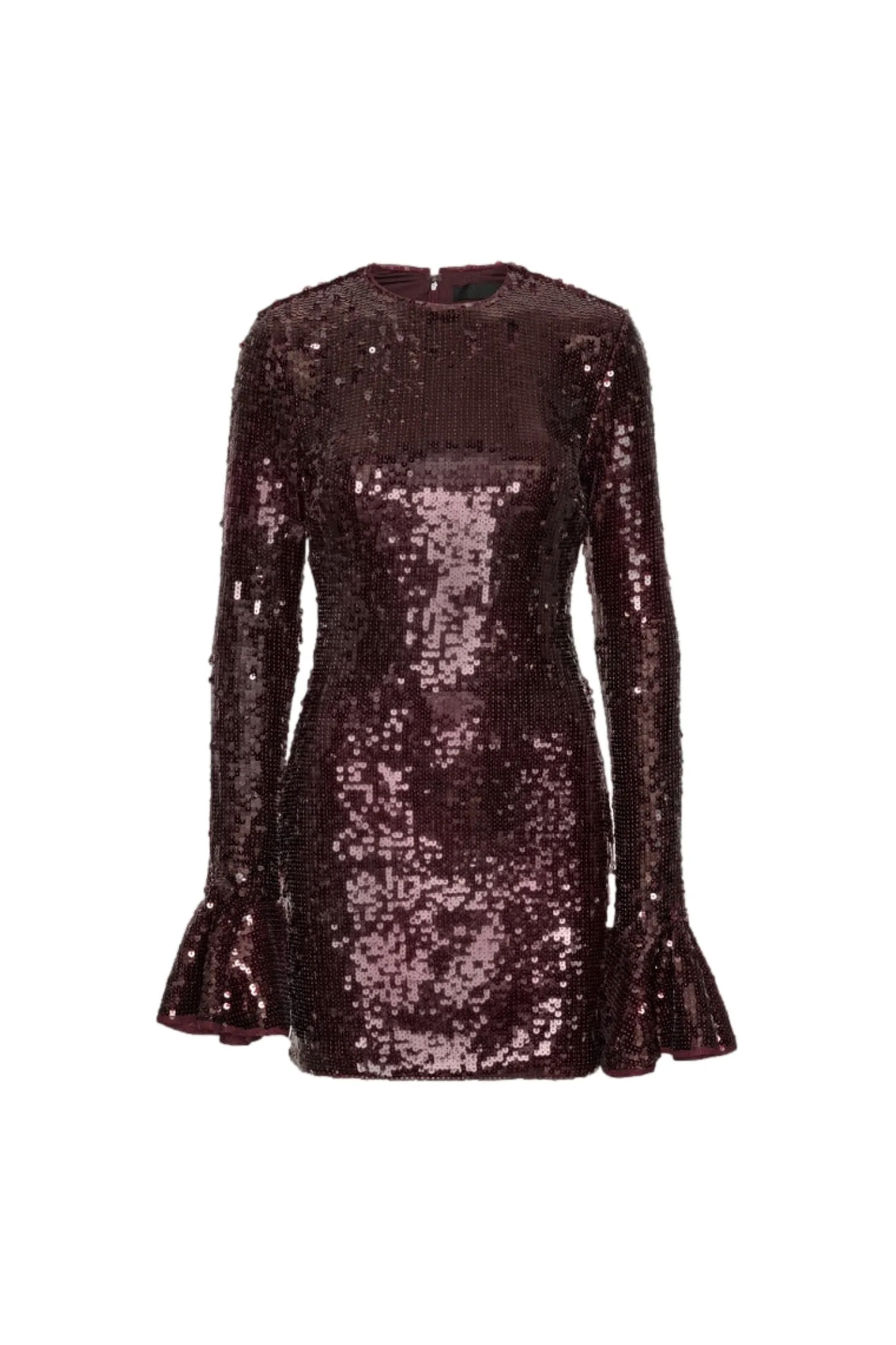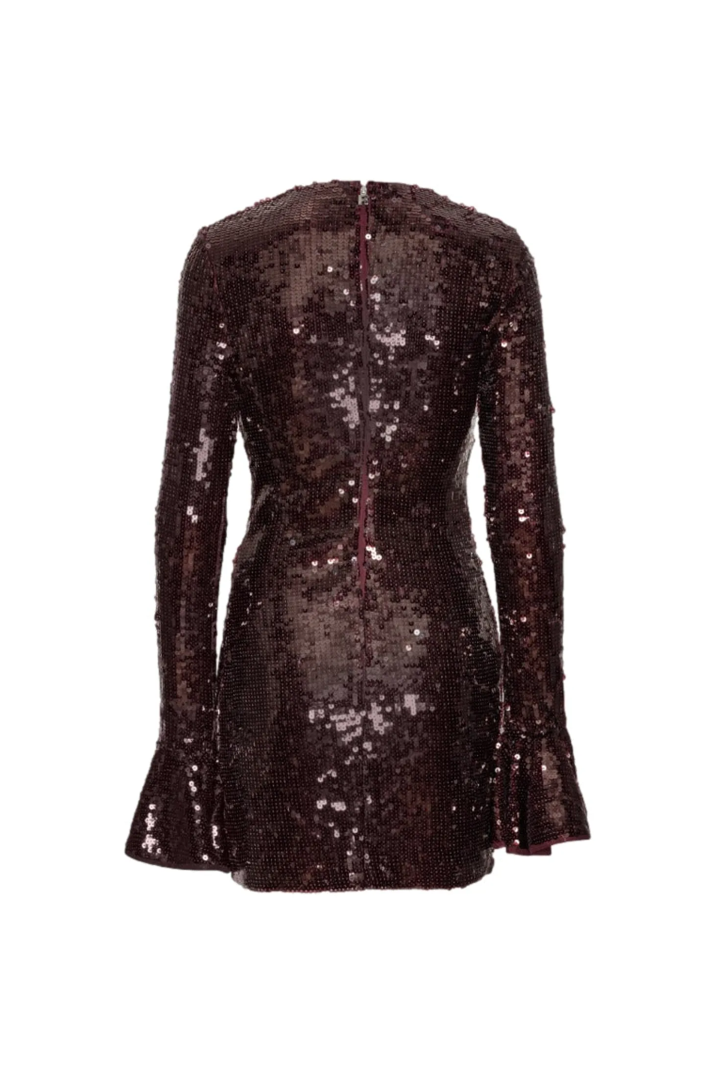Sequins LS Mini Dress Burgundy har en tettsittende silhuett med kort fald og lange ermer. Den har utsvingte mansjetter, rund hals og er helt dekket av paljetter. Kjolen lukkes med en skjult glidelås bak og er designet for å skape en slående og langstrakt form.